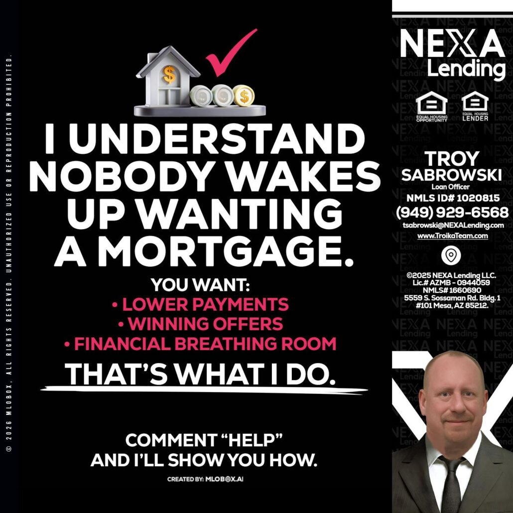 I UNDERSTAND - Troy Sabrowski -Loan OfficerHi, my name is Troy Sabrowski. I’m a Loan Officer with NEXA Lending LLC., offering personalized mortgage solutions, fast customized quotes, great rates and service with integrity.