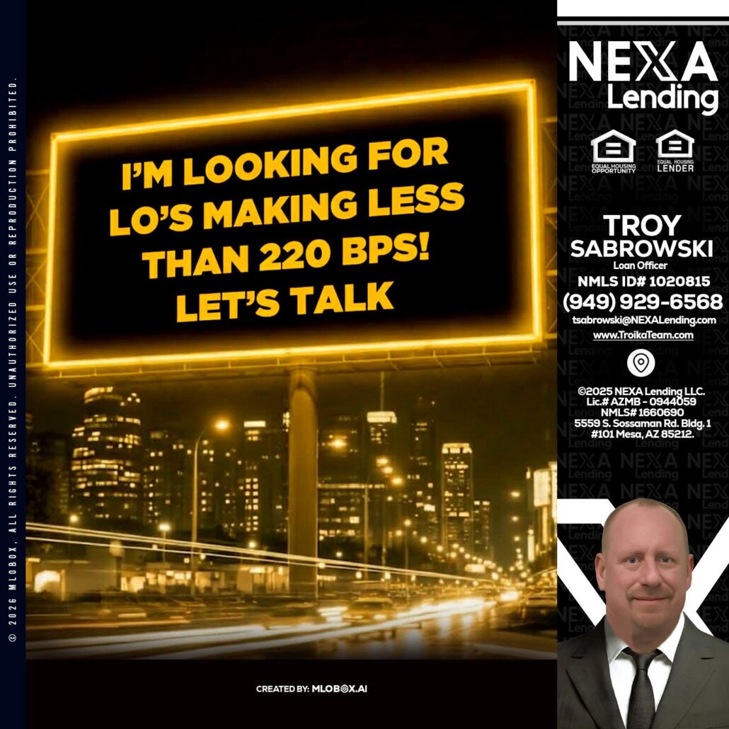 Looking for MLOs - Troy Sabrowski -Loan OfficerHi, my name is Troy Sabrowski. I’m a Loan Officer with NEXA Lending LLC., offering personalized mortgage solutions, fast customized quotes, great rates and service with integrity.