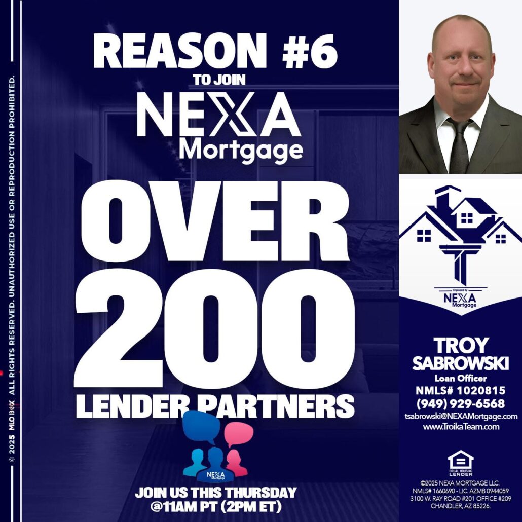 REASON 6 - Troy Sabrowski -Loan OfficerHi, my name is Troy Sabrowski. I’m a Loan Officer with NEXA Mortgage LLC., offering personalized mortgage solutions, fast customized quotes, great rates and service with integrity.