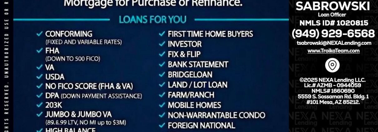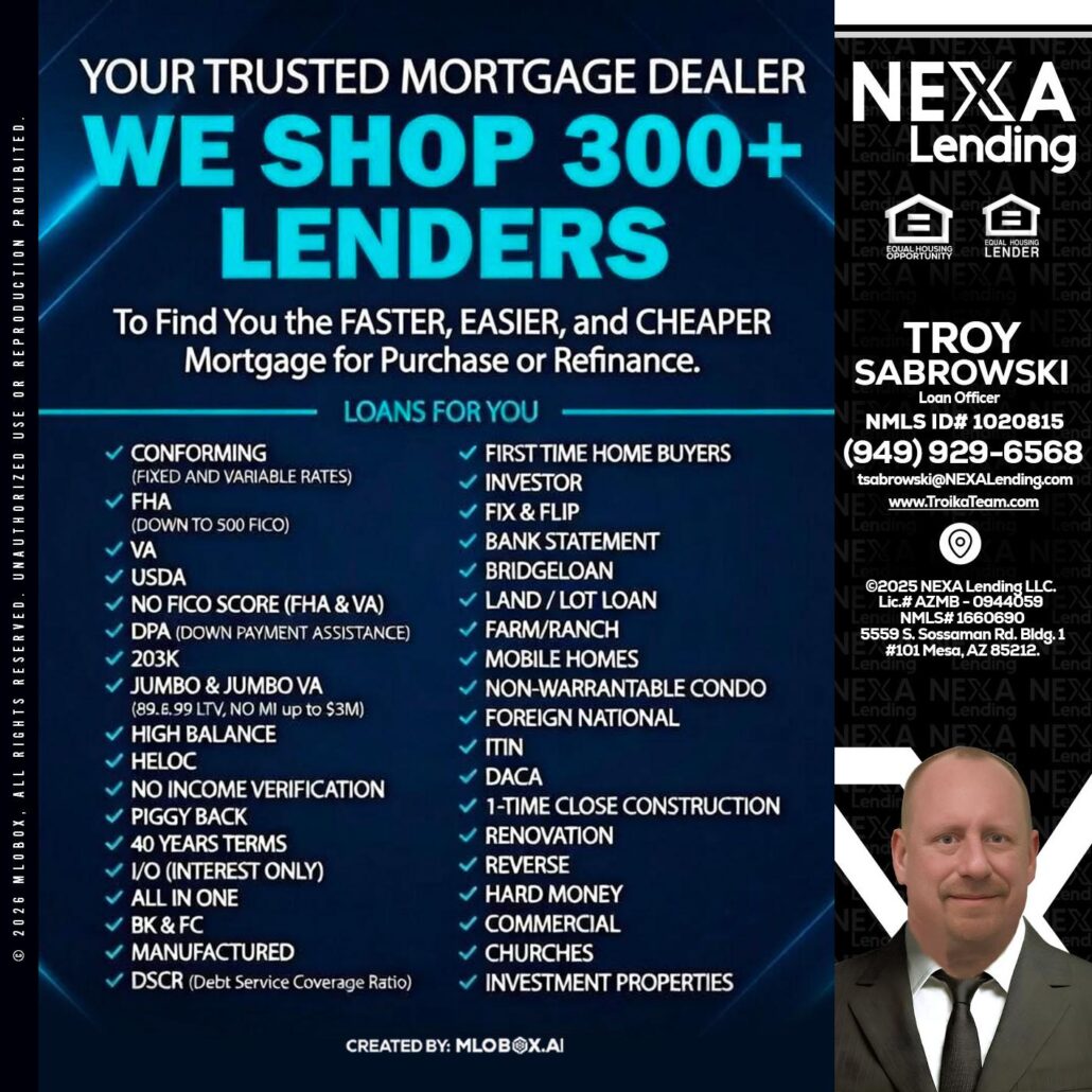 Hi, my name is Troy Sabrowski. I’m a Loan Officer with NEXA Lending LLC., offering personalized mortgage solutions, fast customized quotes, great rates and service with integrity.
